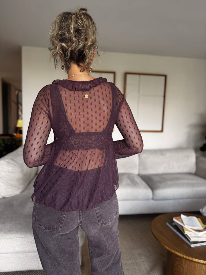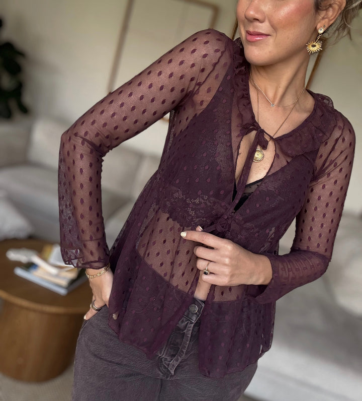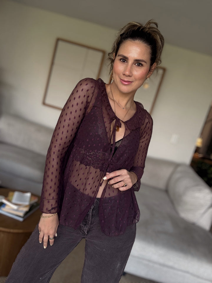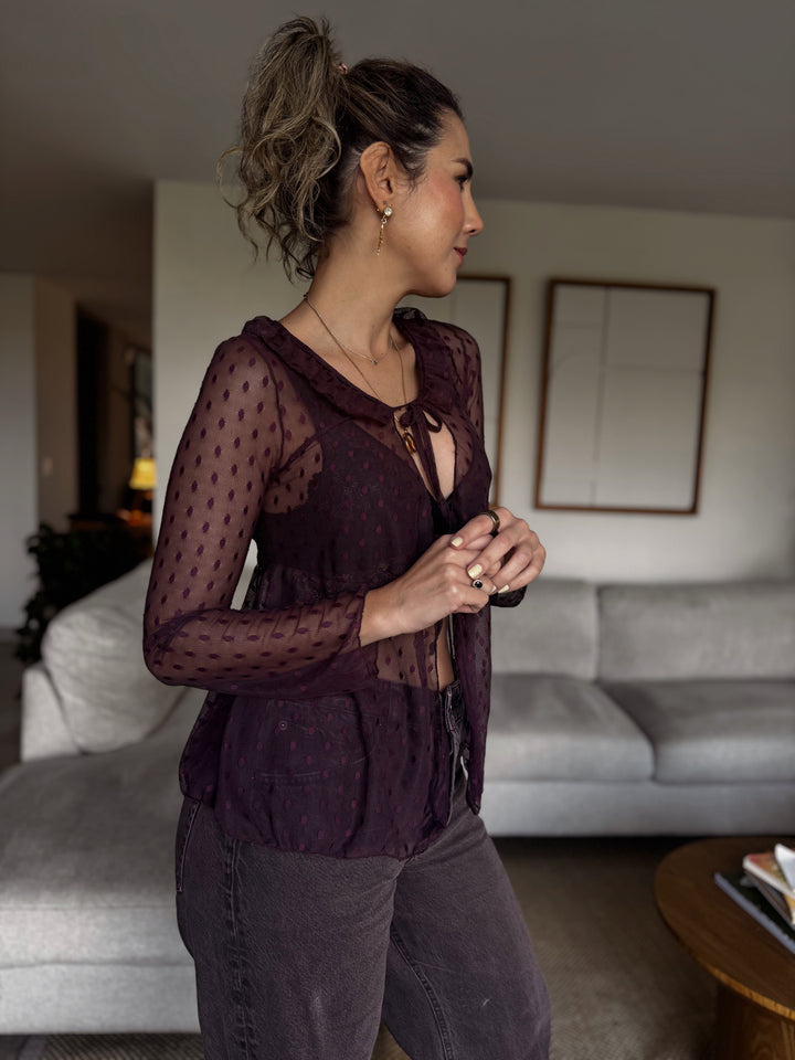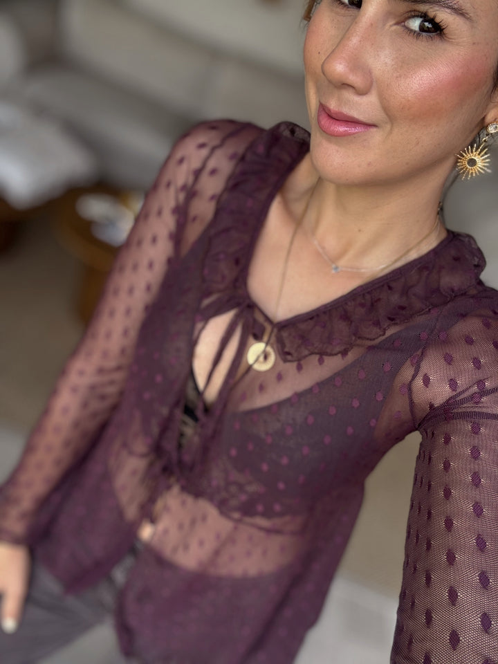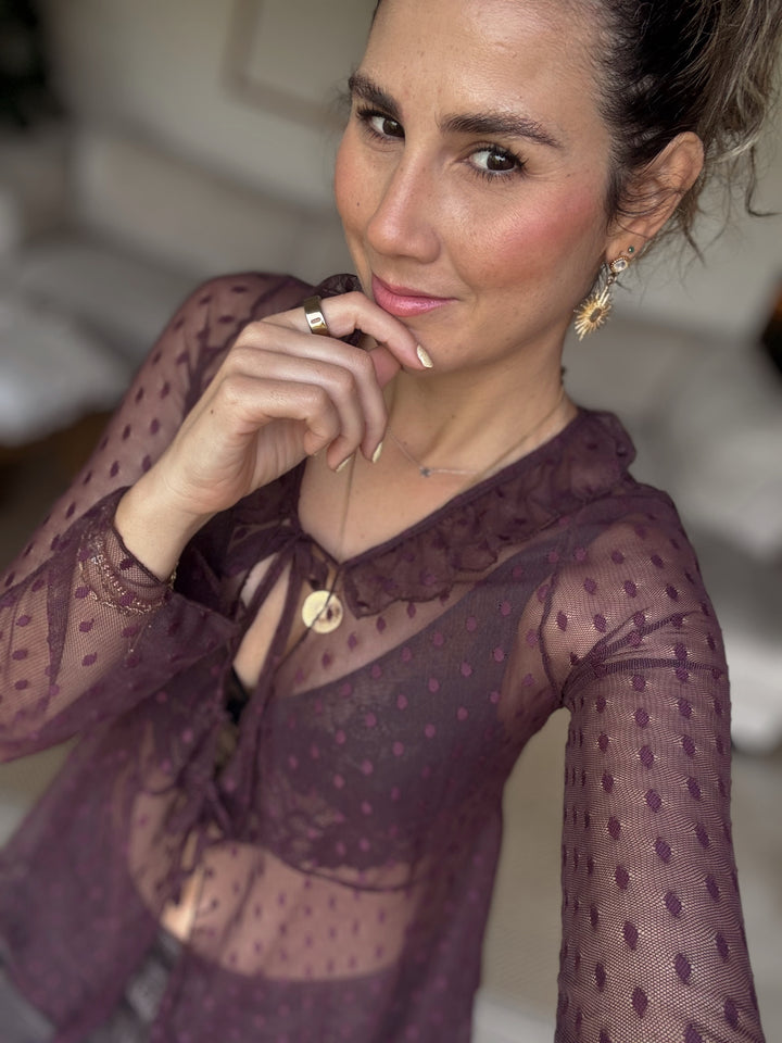 Nuestra Blusa Marshall Una prenda delicada y femenina que combina transparencias sutiles con textura de plumeti y un diseño con amarre frontal.
