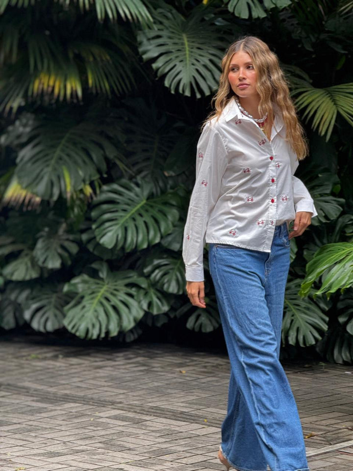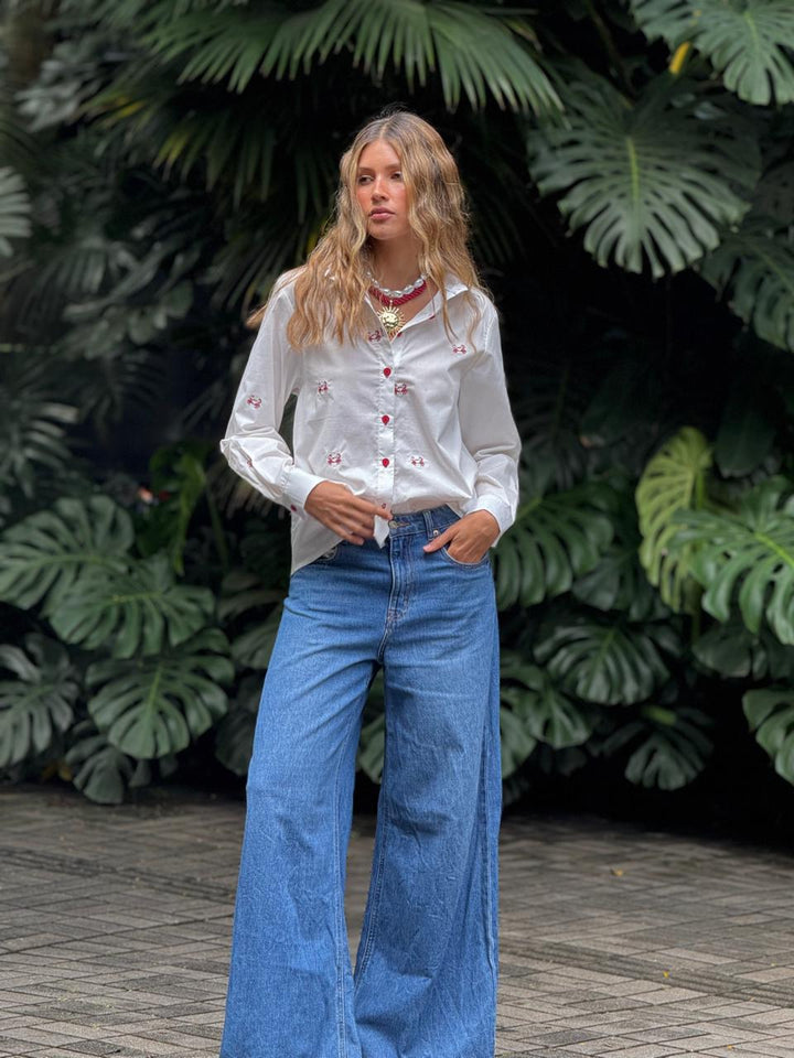 Una prenda clásica con un toque divertido y sofisticado. Su diseño en tela ligera, con bordados de pequeños cangrejos y botones rojos, la convierte en una pieza única y llena de personalidad. Perfecta para combinar con jeans o faldas y lograr un look fresco y diferente.