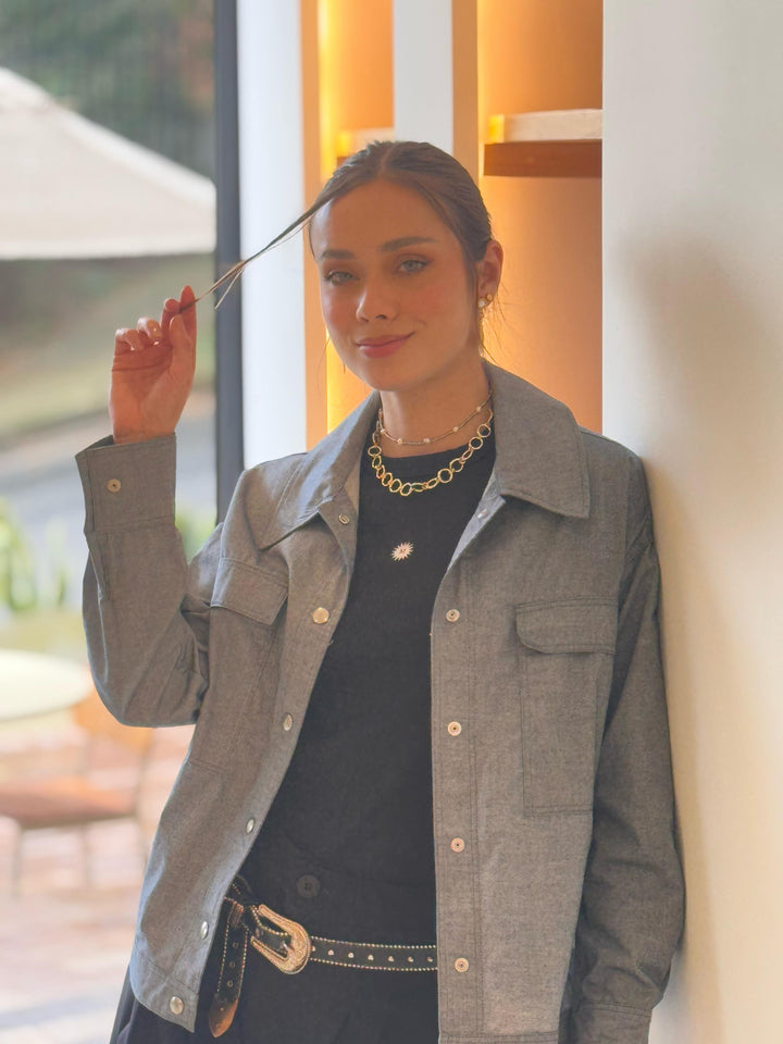 Confeccionada en denim liviano, esta chaqueta se destaca por su bordado. De silueta oversize y botones frontales, es perfecta para elevar tus looks casuales con un aire sofisticado y único.