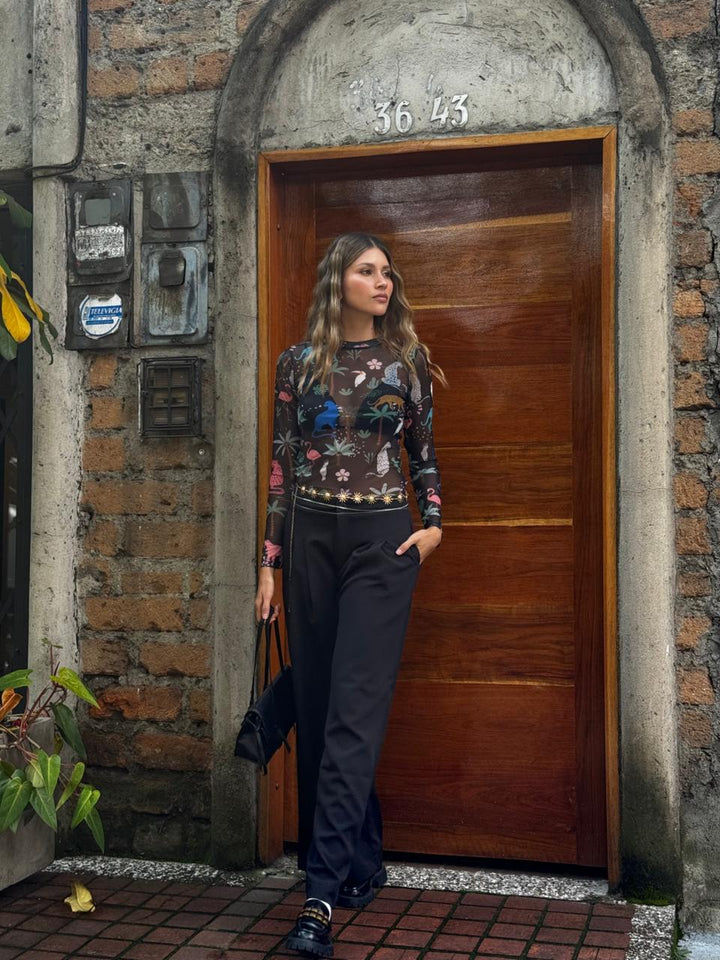 Un diseño que mezcla arte y moda. Su estampado inspirado en la naturaleza y los animales exóticos le da un toque vibrante y diferente a cualquier look. Confeccionada en tela mesh liviana y elástica, se adapta perfectamente al cuerpo brindando comodidad y estilo. Ideal para combinar con pantalones o faldas de tiro alto y crear un outfit lleno de personalidad.