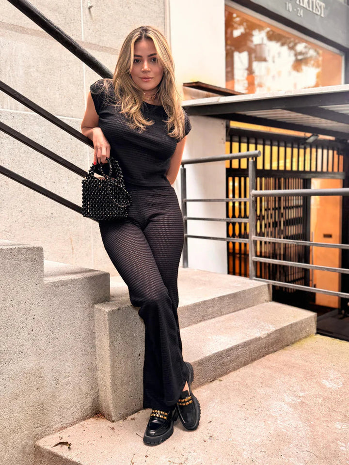 Disponible en tonos neutros como beige y negro. Pantalón y blusa vienen por separado.