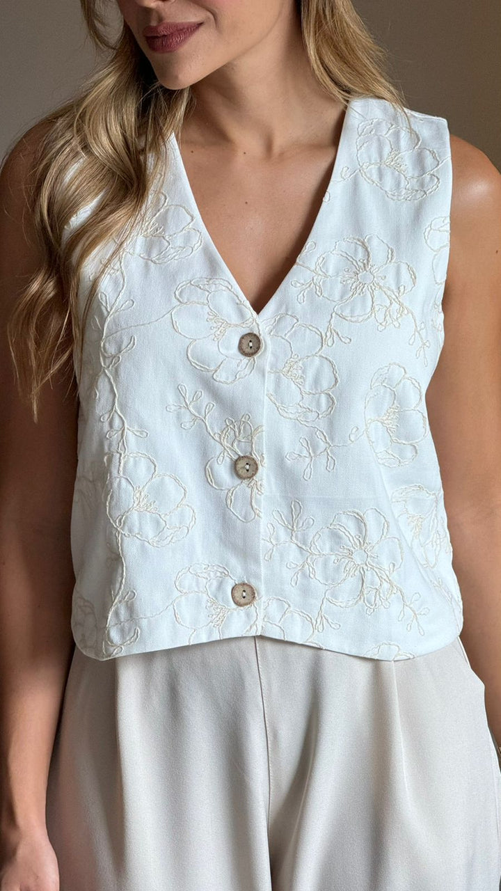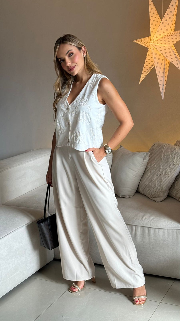 Descubre el SET BRANDI, la combinación perfecta de sofisticación y confort. Este conjunto artesanal presenta un chaleco sin mangas confeccionado en lino puro, adornado con bordados florales delicados que reflejan elegancia en cada detalle.